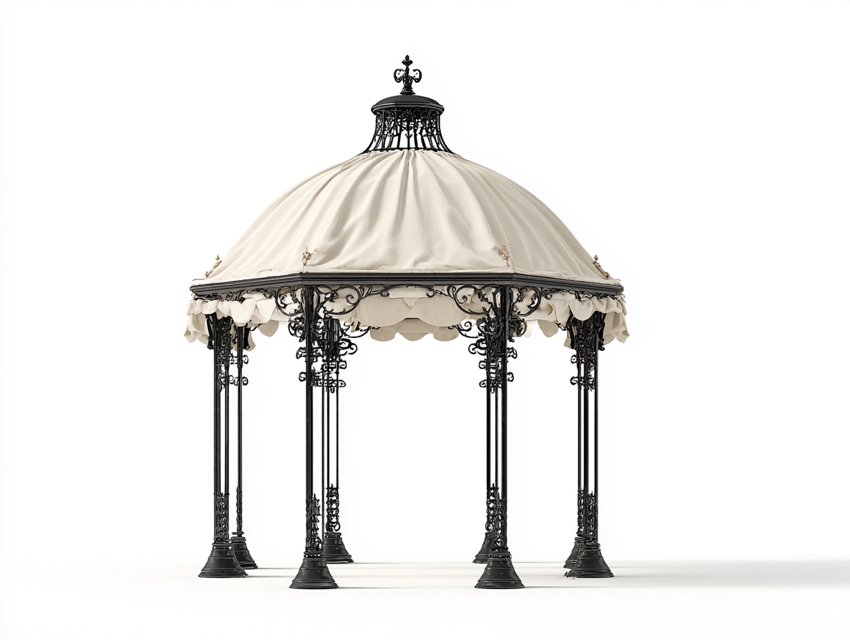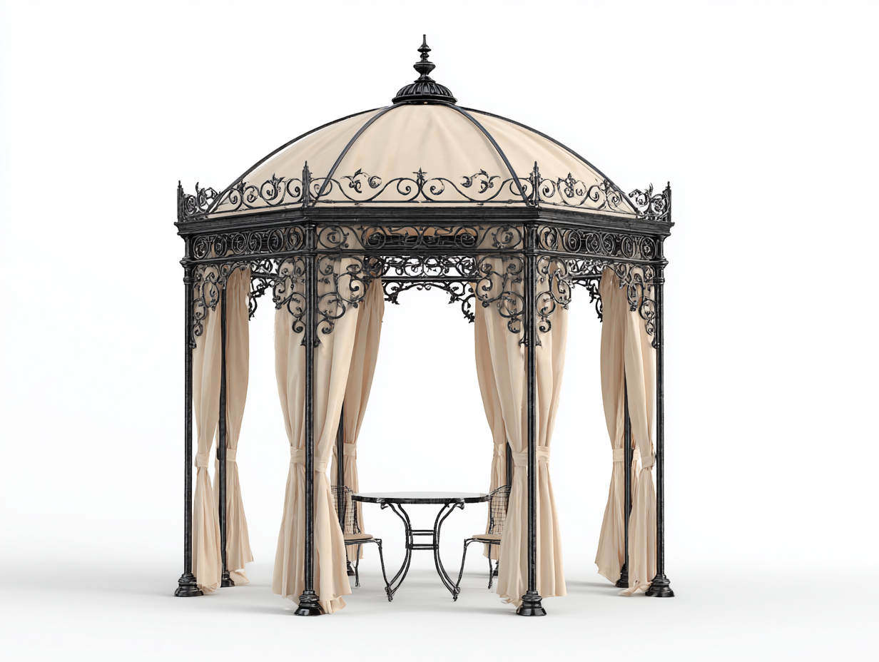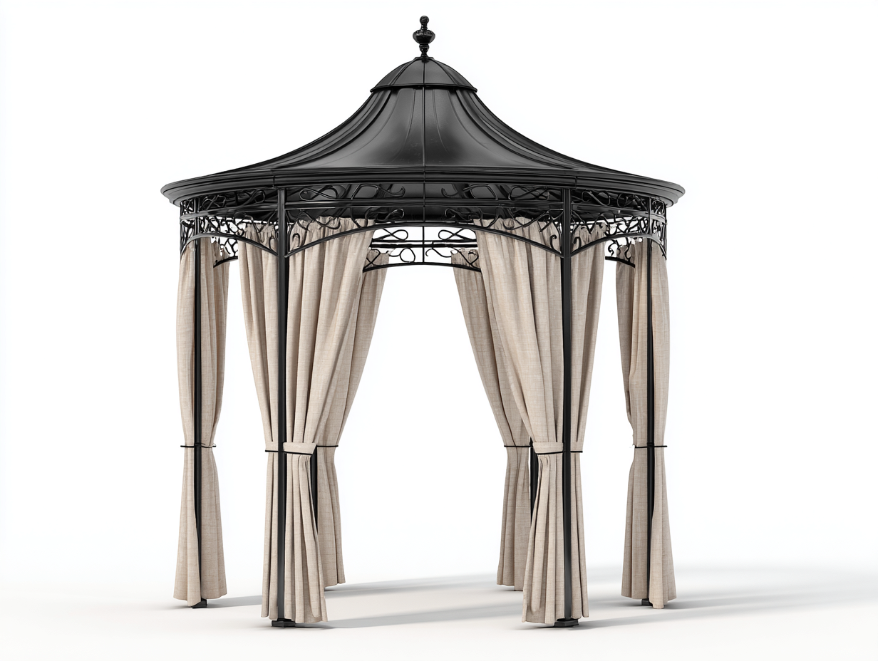 Pérgola de jardín metálica con cortinas 300x300x280 cm beige para exterior - diseño clásico ornamental